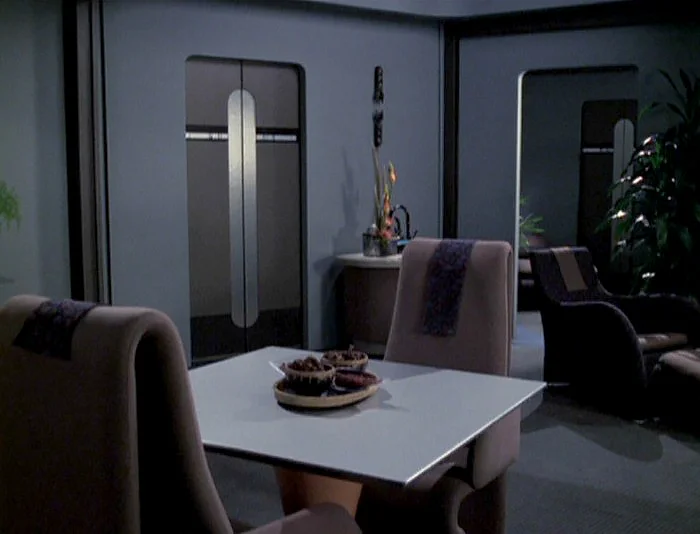 The Klingon handed out assignments for the various officers in the room. Ensign Hegg discovered he would be assigned to the main shuttle bay, which came as little surprise. Ensign Thovin learned he would report to the astrometrics lab. Worf then started listing pairs of names, followed by quarters’ locations. Hegg and Thovin learned they would be bunkmates in quarters located on deck 9, section 16.